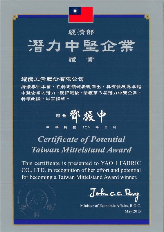 經(jīng)濟(jì)部第3屆卓越中堅(jiān)企業(yè)及潛力中堅(jiān)企業(yè)遴選自103年6月公告受理申請(qǐng),總計(jì)有162家提出申請(qǐng),歷經(jīng)超過半年之嚴(yán)格審查,並於104年3月23公告結(jié)果,耀億工業(yè)股份有限公司獲得「潛力中堅(jiān)企業(yè)」的肯定及殊榮。
