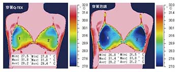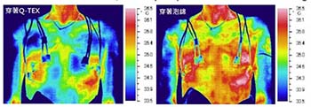 Q-Tex的蜂巢式纖維結構有透氣,排濕,除熱, 透水的特性,能讓皮膚保持干爽,維持皮膚毛孔的呼吸原生態。釋放熱氣測試(數據由日本帝人提供):紅色代表熱氣的釋放,穿著Q-TEX 3分鐘后熱氣釋放顯著。